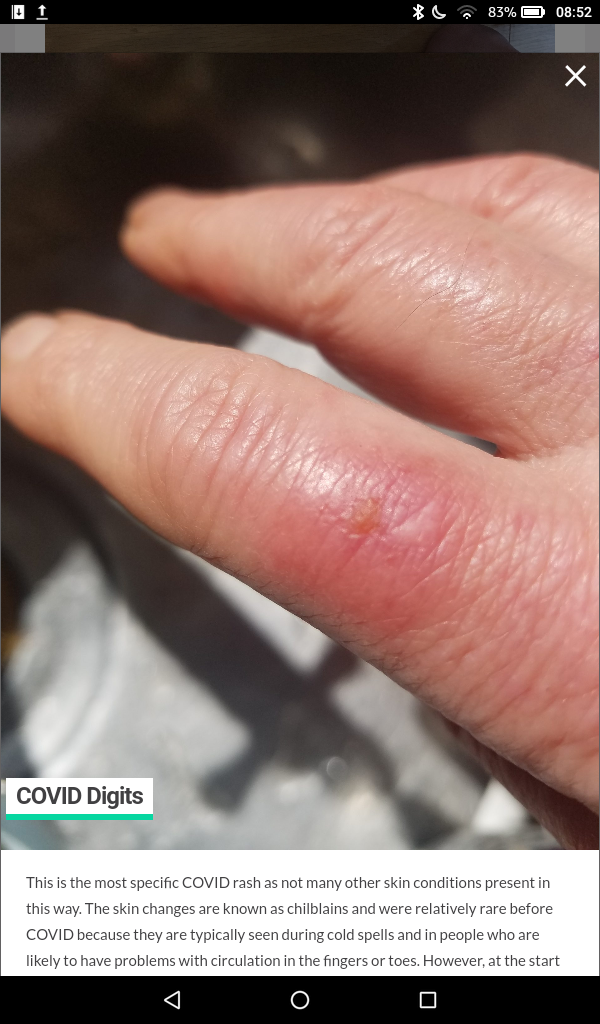 Images of Covid skin rashes, including Covid Finger, at https://covidskinsigns.com