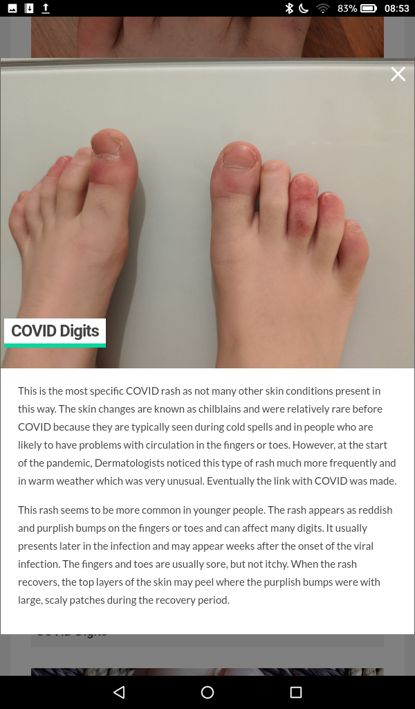 At the top of the third page of the PDF, there are two photos of Covid Toes. The top photo, reminds me of my left big toe, which was the first sign of things to come for me. But the photo next to top, looks much more like 'a normal chilblain' to my eyes.