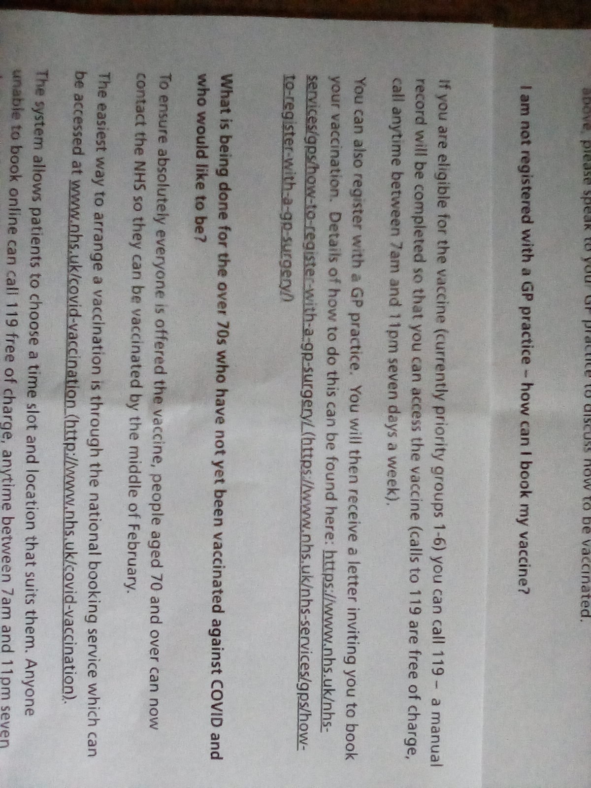 When I noticed that BOOTS in Coventry was doing the jab, a couple of days ago, I asked about this. A very helpful chap behind the pharmacy counter, used his skills in Navigating the NHS website and tracked down something which says you can book a jab via the 119 number, without being registered with a GP (see the image). About thirty minutes ago, I phoned 119 and the woman at 119 said she (and her colleagues) were unable to arrange for a vaccination, unless a caller is registered with a GP. She said 'their system did not allow them to do it'. So: it seems the NHS website says you can access the Covid vaccination without being registered with a GP, via the 119 number - but, if you call 119, then 119 tell you it isn't possible. NOT a satisfactory state of affairs, in my opinion. I am not sure, if I will be able to track down the document from which the kind gentleman at BOOTS printed the relevant pages for me.